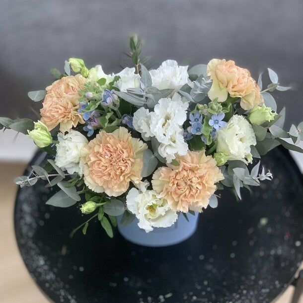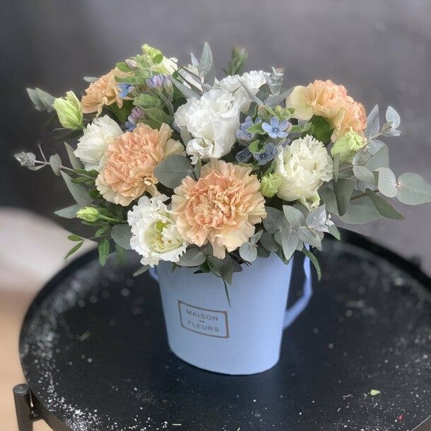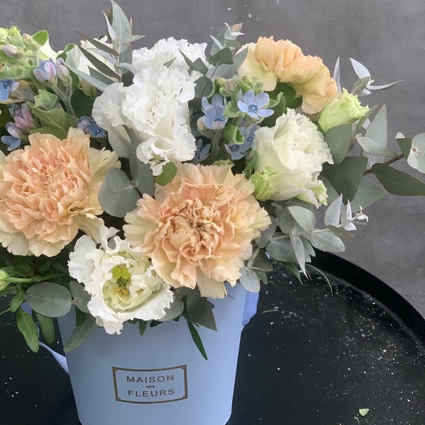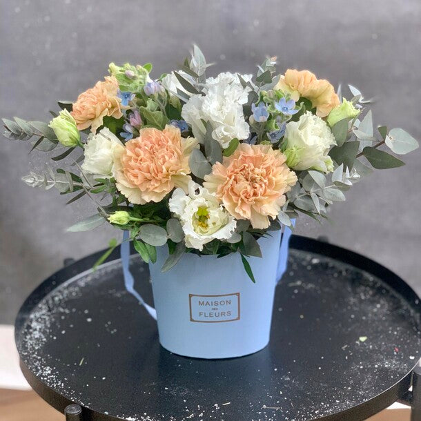 An author's composition in a hat box. Important: the composition is made on a floristic sponge and is not disassemblable. It is necessary to add water between the flowers on the sponge every 2 days.