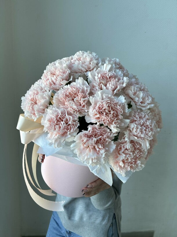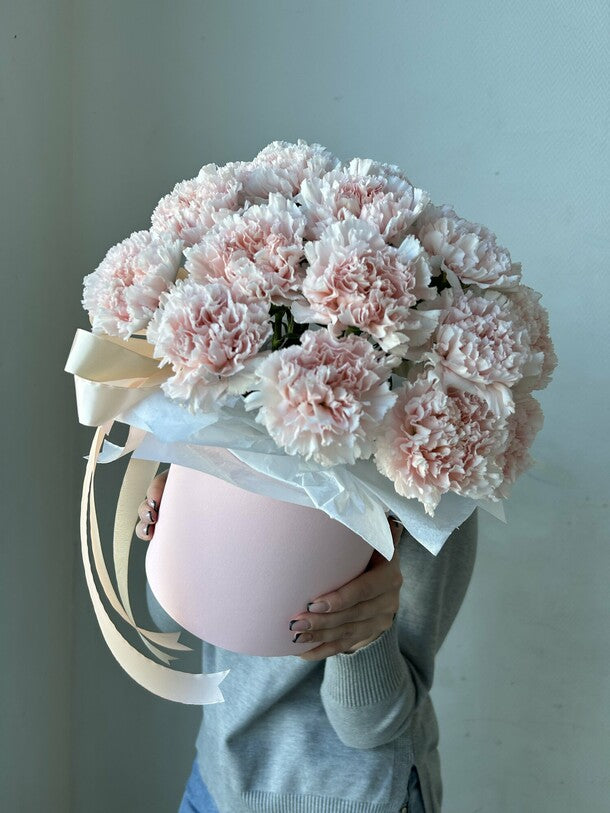 This beautiful arrangement features 25 pink Dianthus flowers in a stylish hat box. Dianthus is a delicate flower with abundant blooms and a sweet fragrance that captivates with its softness and elegance. This bouquet is the perfect gift for any occasion, from a romantic evening to a holiday celebration.